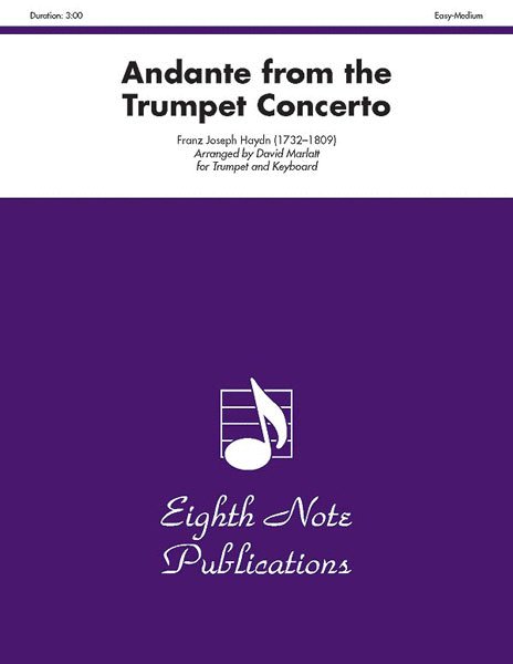 The Haydn Trumpet Concerto is one of the most recognizable pieces of music for trumpet. The beautiful Andante movement has been played by countless trumpet players in concerts and competitions. This version has been transposed down a fourth which allows younger musicians to perform this work. By lowering the piece, the highest note required is an F which is reasonable to attain in the first year or so of playing.